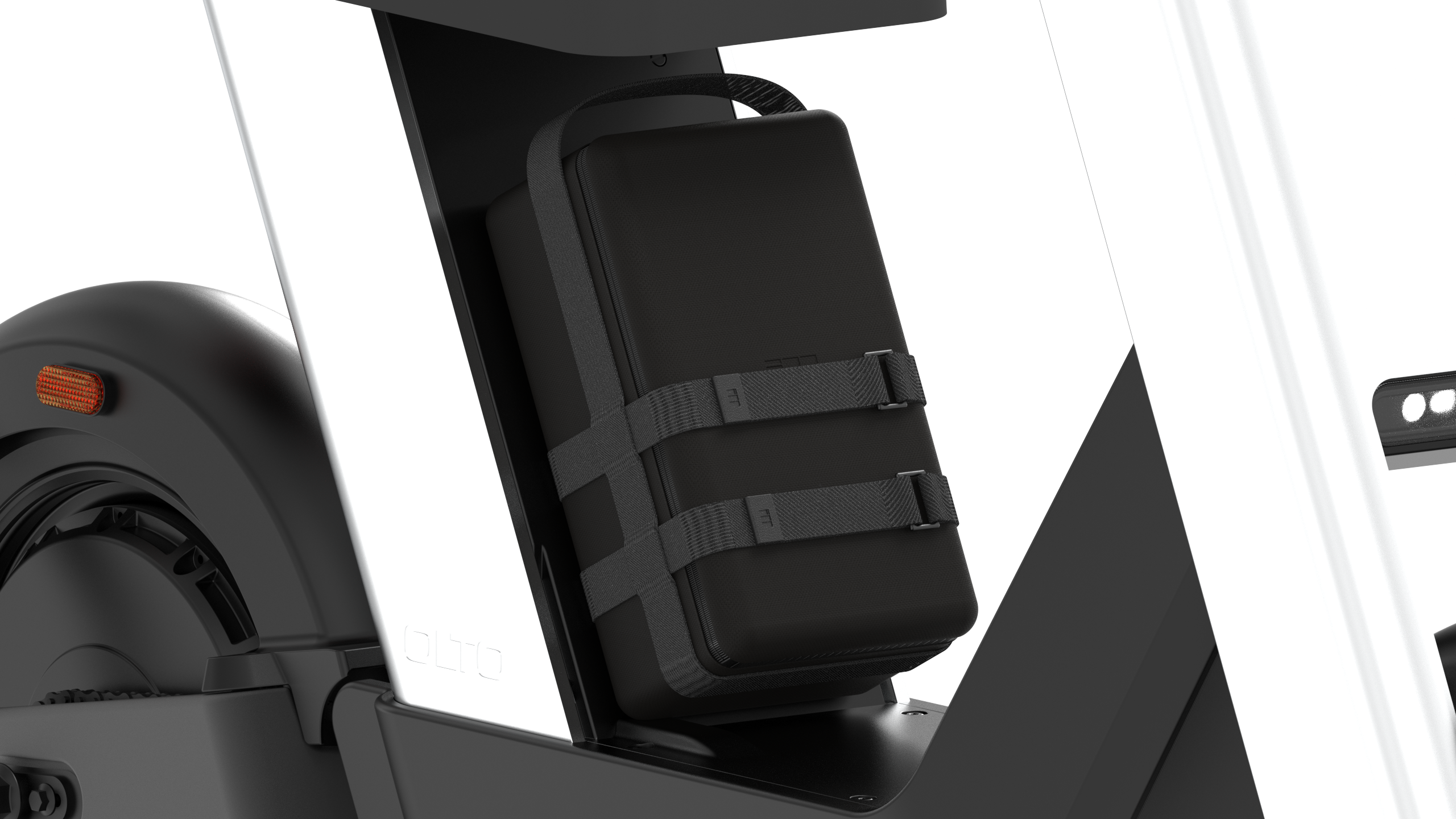 The Underseat Bag fits in P1s under-seat storage compartment with room to spare and straps to Olto’s seat stem to carry your charger and other essentials on the go.