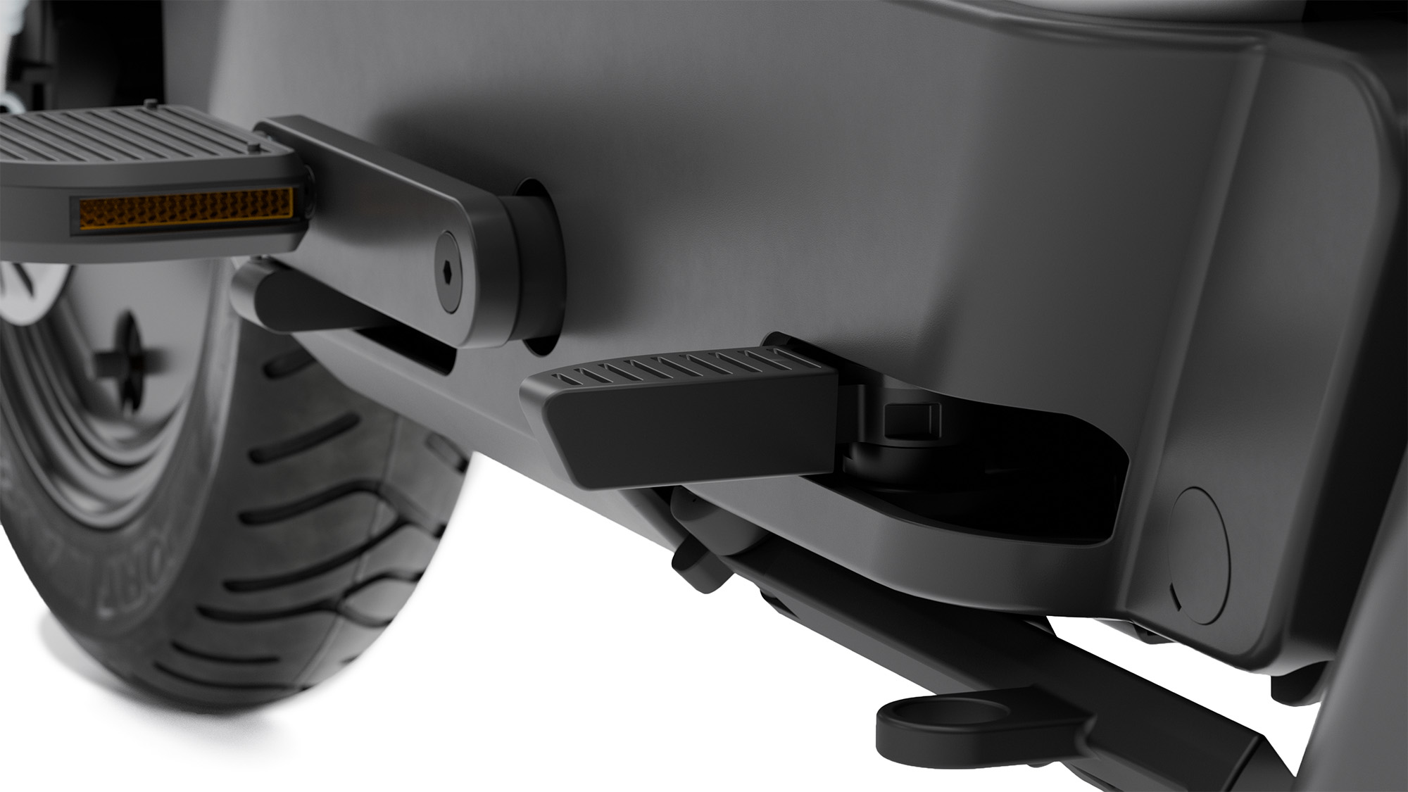 Olto is made for riding with a second passenger. The standard seat fits two. Activate the hidden foot pegs and they’ll pop into place for a comfortable backseat ride. Tap them again and they disappear.